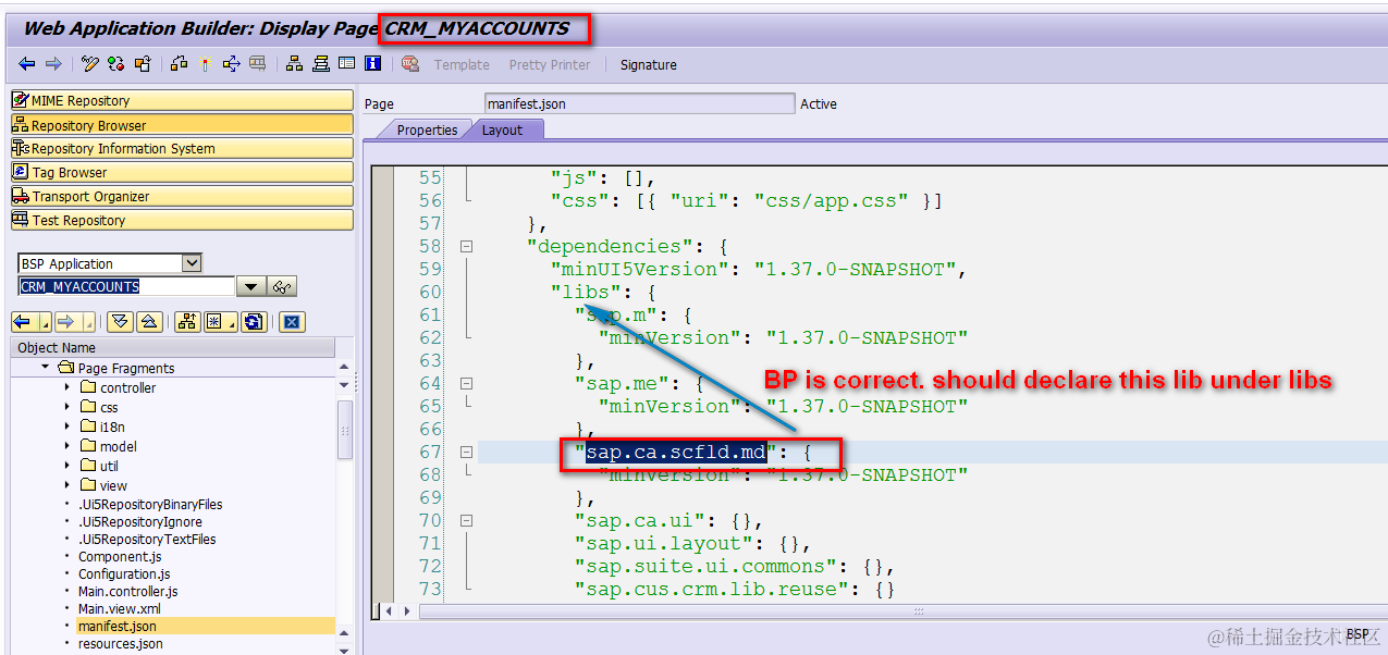 发现差异就在于sap.ca.scfld.md。仔细看上面的图:对于BP来说,sap.ca.scfld.md落在UI5LIB下面,对于我们的应用来说,sap.ca.scfld.md落在UI5COMP上。