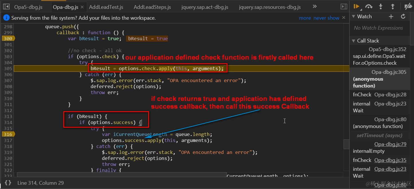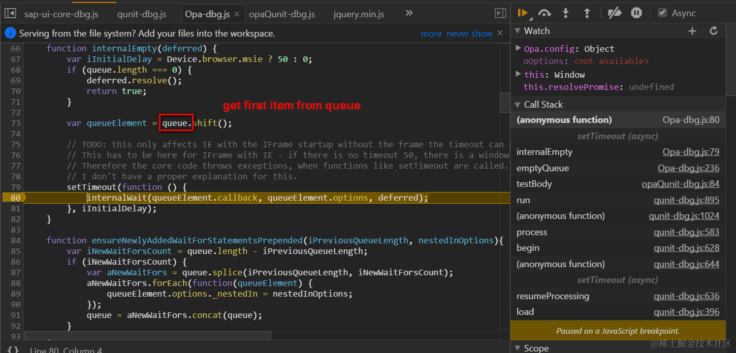 Remember, our test code will never immediately trigger OPA execution. Instead, the code will just insert directive into queue and return. The real OPA execution is triggered by Opa.emptyQueue, see line 73 below. The directive in the head of queue is fetched via Array.prototype.shift, and internal polling is started via internalWait.