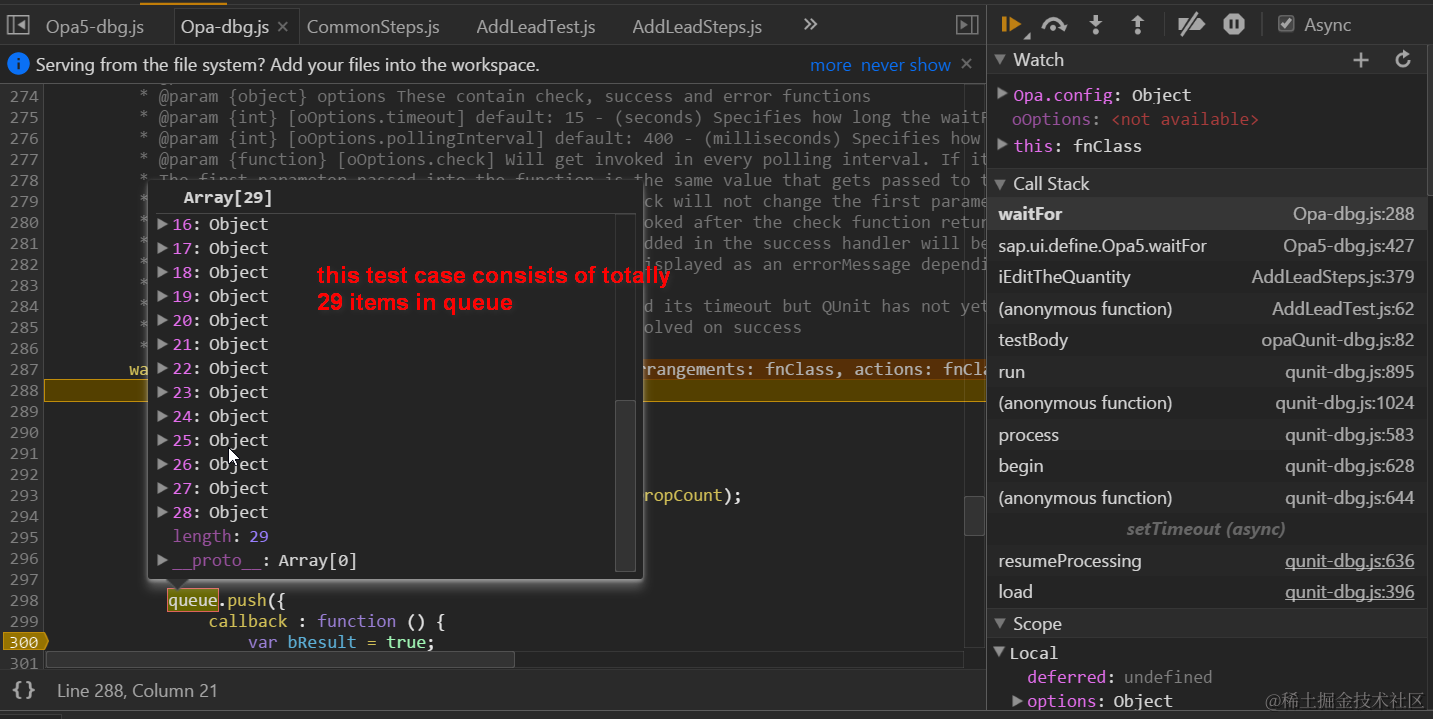 For the test case “Add Lead View Test1”, there are totally 29 items in the queue to be executed one by one. You can check queue content from variable queue in line 298 below.