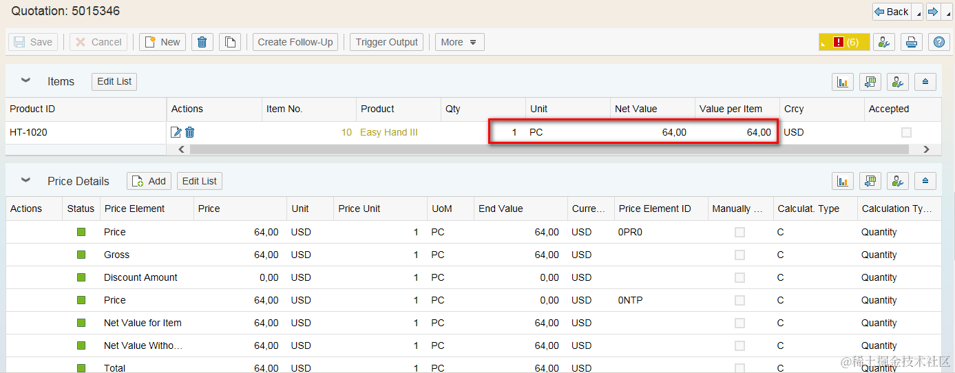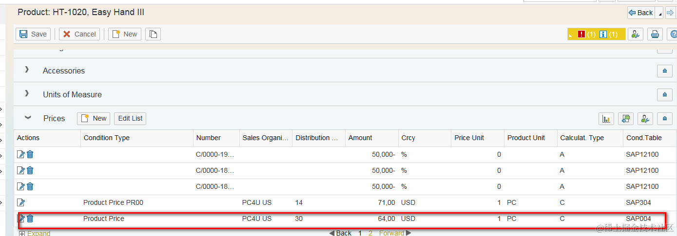 - Create a condition record in Product overview page, Prices assignment block. This record represents a rule that the base price of 1 PC = 64 USD for Sales Organization PC4U US and Channel 30.