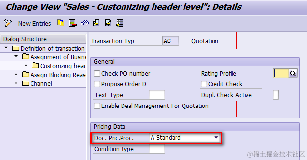 - in transaction type customizing, assign “A” - standard document pricing procedure to the transaction type. The field “Condition type” is reserved for interaction center scenario so could remain empty in one order processing scenario.
