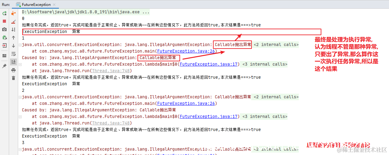 * get方法过程中抛出异常,for循环为了演示抛出Exception的时机:并不是说一产生异常就抛出,直到我们get执行时,才会抛出。