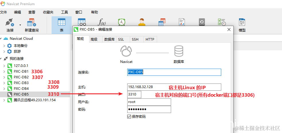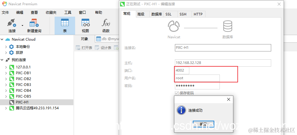 数据库客户端连接测试(这个数据库只是转发作用,为了保证高可用,创建了2个数据库发,PXC-H1和PXC-H2,用户请求到这两个转发器数据库后,会被转发到PXC-DB1到PXC-DB5中的任何一个,然后把剩下的4个数据库同步.这也体现了去中心化.至于准发规则,前面配置文件已经配置了)