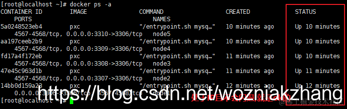 [root@localhost ~]# docker run -d -p 3310:3306 -e MYSQL_ROOT_PASSWORD=root -e CLUSTER_NAME=PXC -e XTRABACKUP_PASSWORD=root -e CLUSTER_JOIN=node1 -v v5:/var/lib/mysql -v backup:/data --privileged --name=node5 --net=net1 --ip 172.18.0.6 pxc