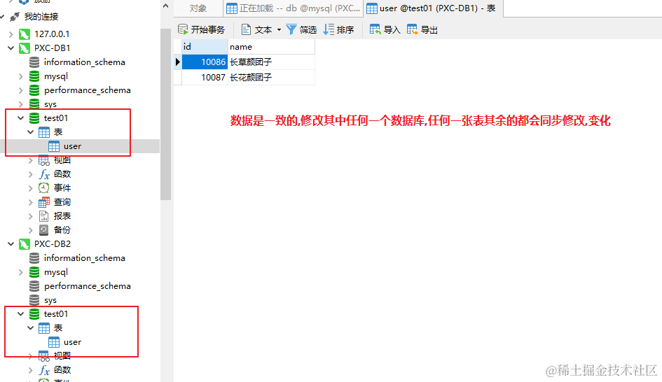 在PXC-H1和PXC-H2修改数据查看真实数据库PXC-DB1到PXC-DB5看数据是否跟着修改了,如果是,那么就成功搭建了PXC的MySQL数据库集群的负载均衡