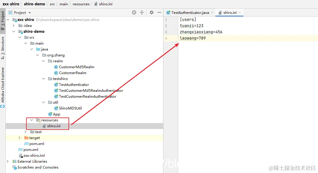 * TestAuthenticator:方式1:使用ini配置文件模拟数据库的用户数据进行认证