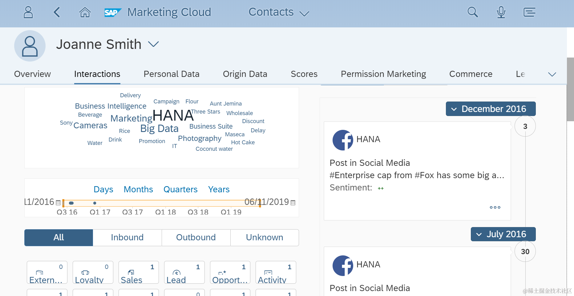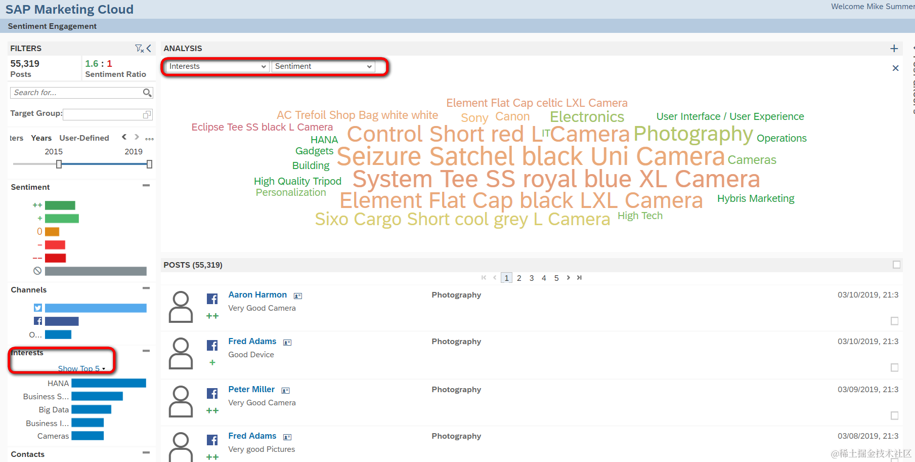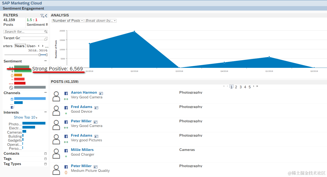 SAP Marketing Cloud的sentiment engagement 已注销 2021-04-25 76 阅读1分钟 两个加号代表情感值为strong positive: 显示这五万多条帖子的正向情感和负向情感的比值,每一年的帖子数明细和情感值明细。 显示所有contact感兴趣的subject和排名前五的subject: 根据contact的发帖数从高到低排名: 要获取更多Jerry的原创文章,请关注公众号"汪子熙":