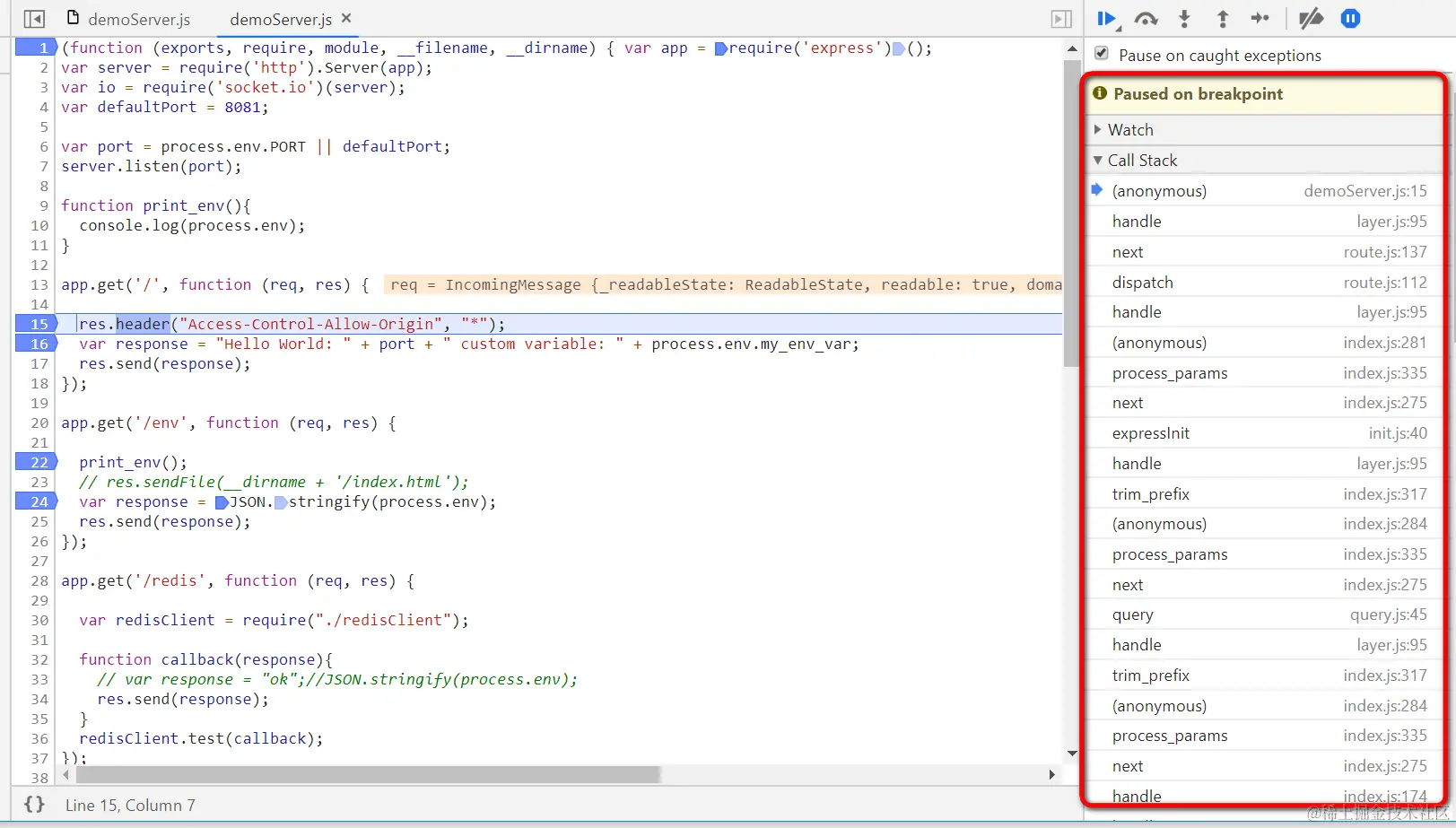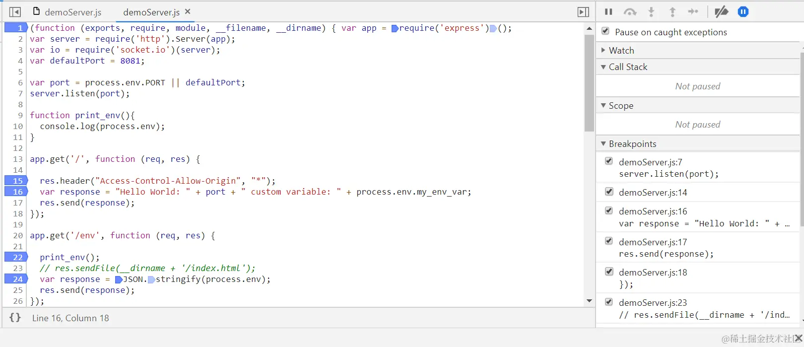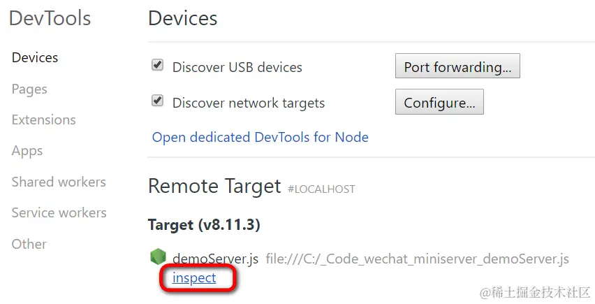 使用node --inspect调试应用 已注销 2021-04-25 139 阅读1分钟 我们可以使用Chrome外加nodejs自带的 --inspect来调试应用。 chrome://inspect, 点击inspect按钮: 在弹出的Chrome开发者工具里设置断点: 设置好断点后,浏览器里输入http://localhost:8081/,断点触发: 要获取更多Jerry的原创文章,请关注公众号"汪子熙":