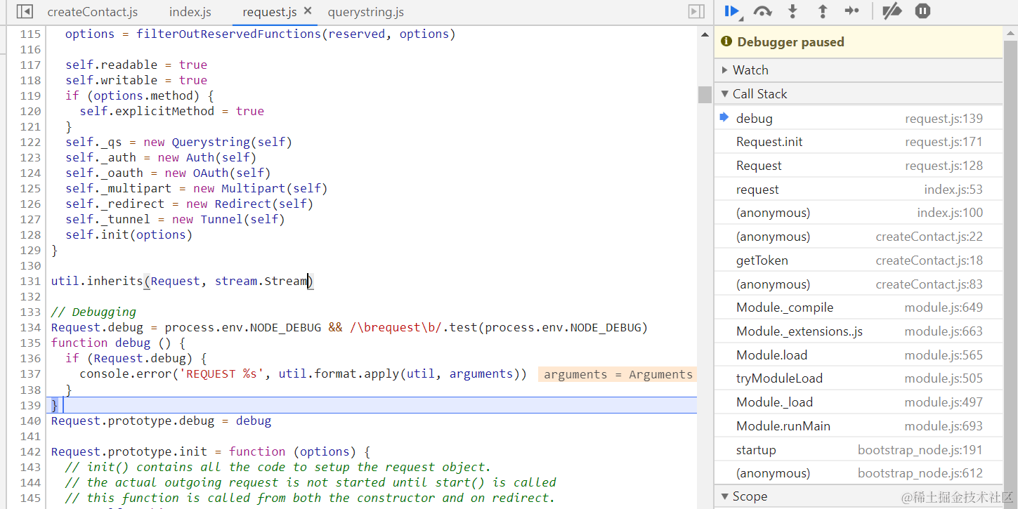 第134行, 把nodejs当前的环境变量NODE_DEBUG的值写入Request.debug这个标志位。如果标志位为true,则request的很多常用方法调用的时候,都会自动调用debug方法,在控制台上打出有用的辅助信息。