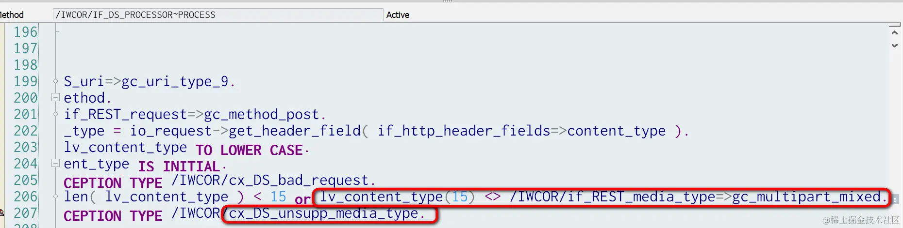 在方法/IWCOR/CL_DS_PROC_DISPATCHER->/IWCOR/IF_DS_PROCESSOR~PROCESS里:如果content-type不为multipart-mixed, 则抛出异常: unsupported media type