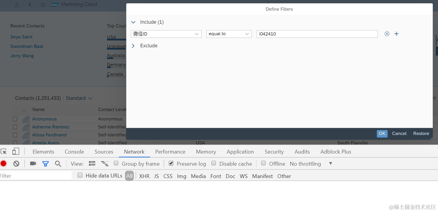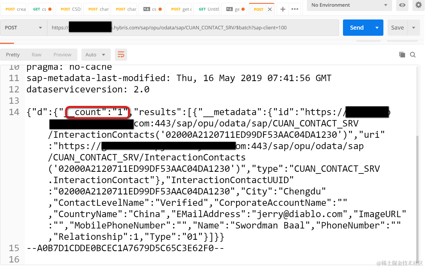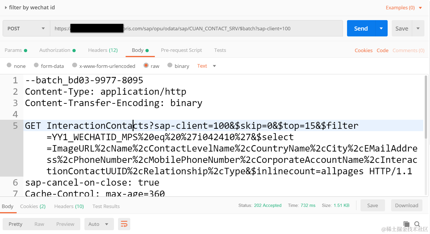 GET InteractionContacts?sap-client=100&KaTeX parse error: Expected 'EOF', got '&' at position 7: skip=0&̲top=15& f i l t e r = Y Y 1 W E C H A T I D M P S filter=YY1_WECHATID_MPS%20eq%20%27i042410%27& filter=YY1WECHATIDMPSselect=ImageURL%2cName%2cContactLevelName%2cCountryName%2cCity%2cEMailAddress%2cPhoneNumber%2cMobilePhoneNumber%2cCorporateAccountName%2cInteractionContactUUID%2cRelationship%2cType&$inlinecount=allpages HTTP/1.1