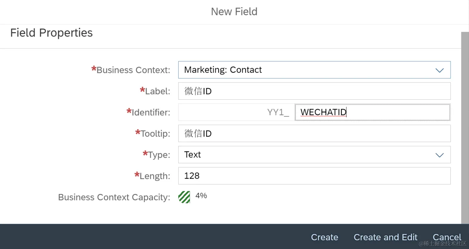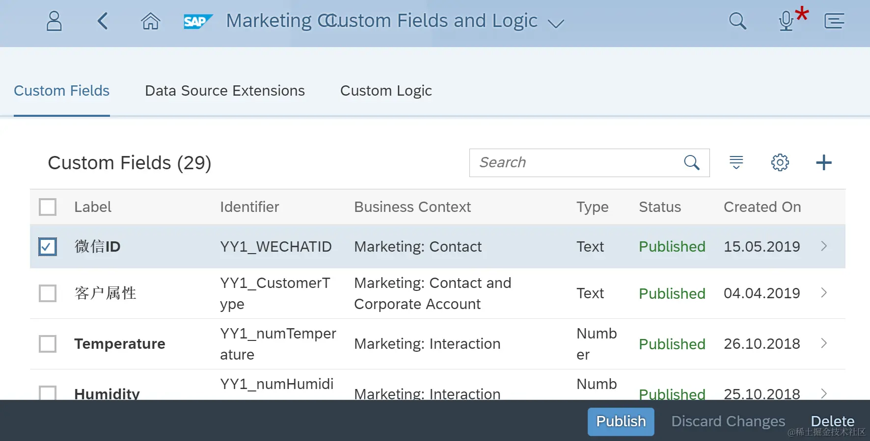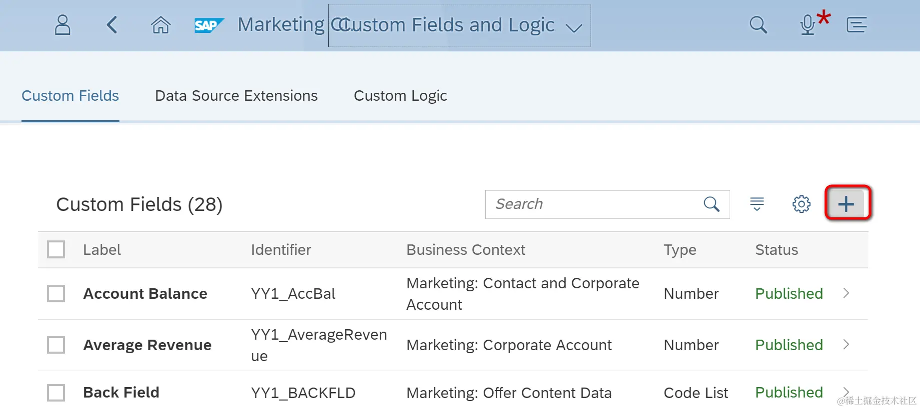 这会进入Fiori应用“Custom fields”,能看到系统里所有创建好的extension field。点击+加号按钮新建一个: