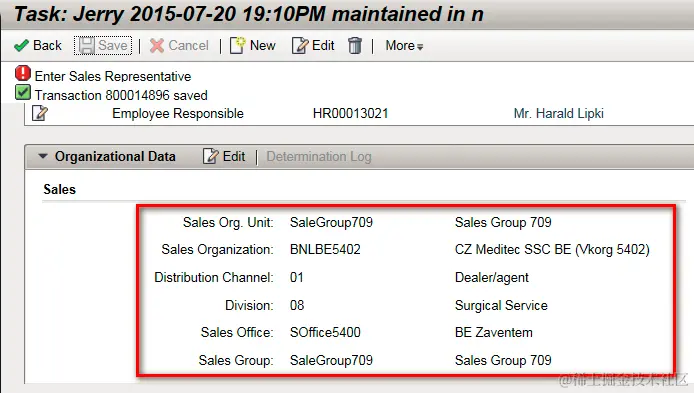 approach1: configure the necessary organization determine procedure to ensure every time the task is created, the related sales organization data could be correctly determined accordingly.