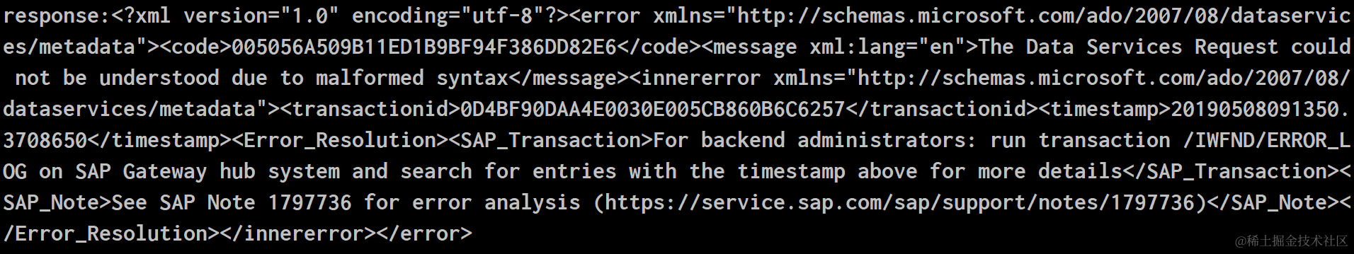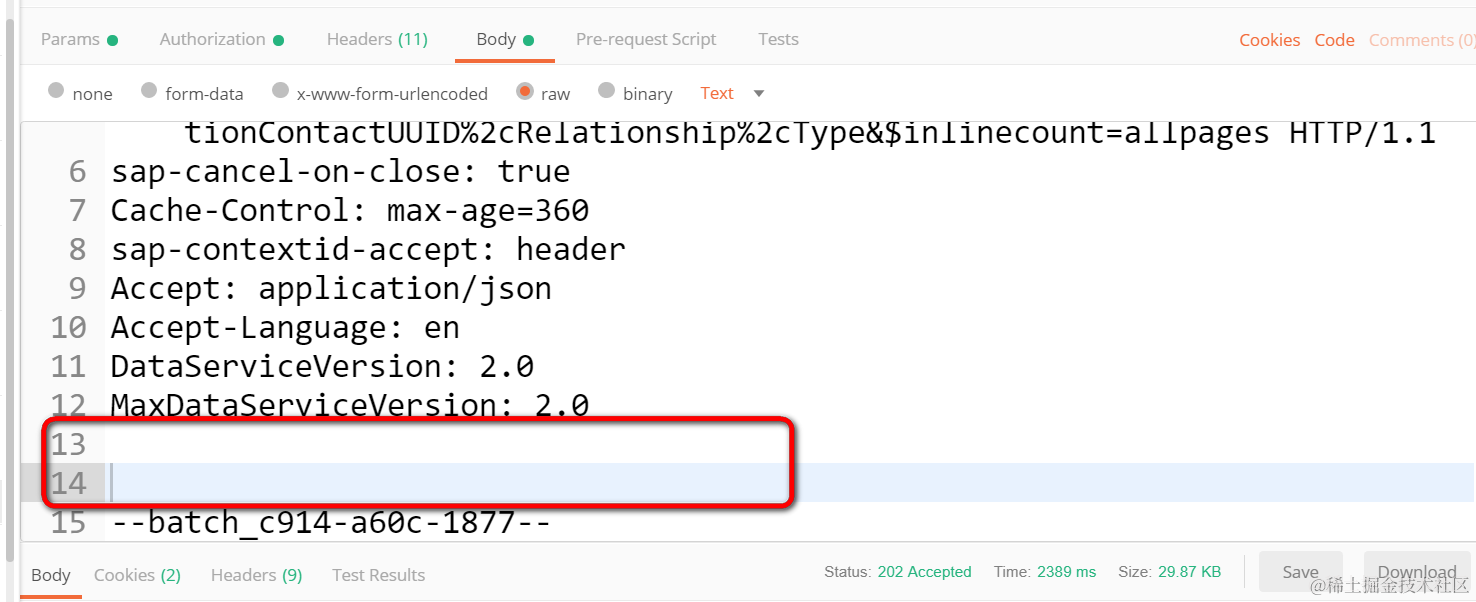 如何处理Marketing Cloud OData服务的错误消息 已注销 2021-04-25 40 阅读1分钟 错误消息:The Data Services Request coulnot be understood due to malformed syntax 少了两个换行符: 加上之后就工作了: 要获取更多Jerry的原创文章,请关注公众号"汪子熙":