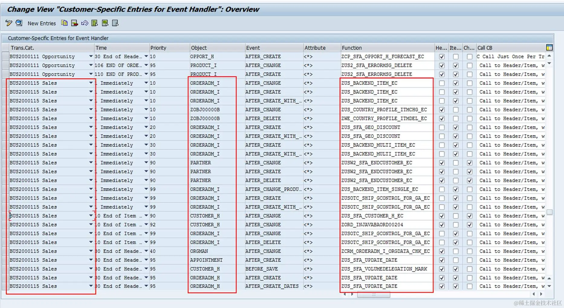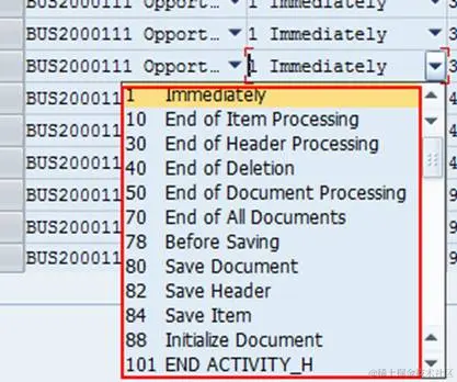 界面如下, 可以看到某个function 比如第3行 ZCRM_CP_PRIN0_ITMCHG_EC被注册到了BUS200001这个general 类型上, immediately执行, event事件是在after_change,即发生改变就触发这个函数,优先度为0,那就是先执行它, 后续可能其他function注册为1,2,3,顺序执行, 执行的触发函数是下面界面的form execute_callbacks_planned; 因为item那项有勾, 只执行ITEM level的也就是item发生改变时执行, header改变的时候不执行,不知道理解的对不对?