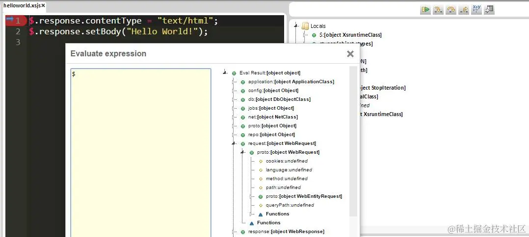 XSE的service是通过server side javascript实现的,这些javascript就是前一封邮件里在HANA studio里能找到的那些source code。和我们已经很熟悉的client side javascript相比,这些server side javascript在Chrome的F12里无法看到,也无法在client端debug,因为其是执行在server端的。