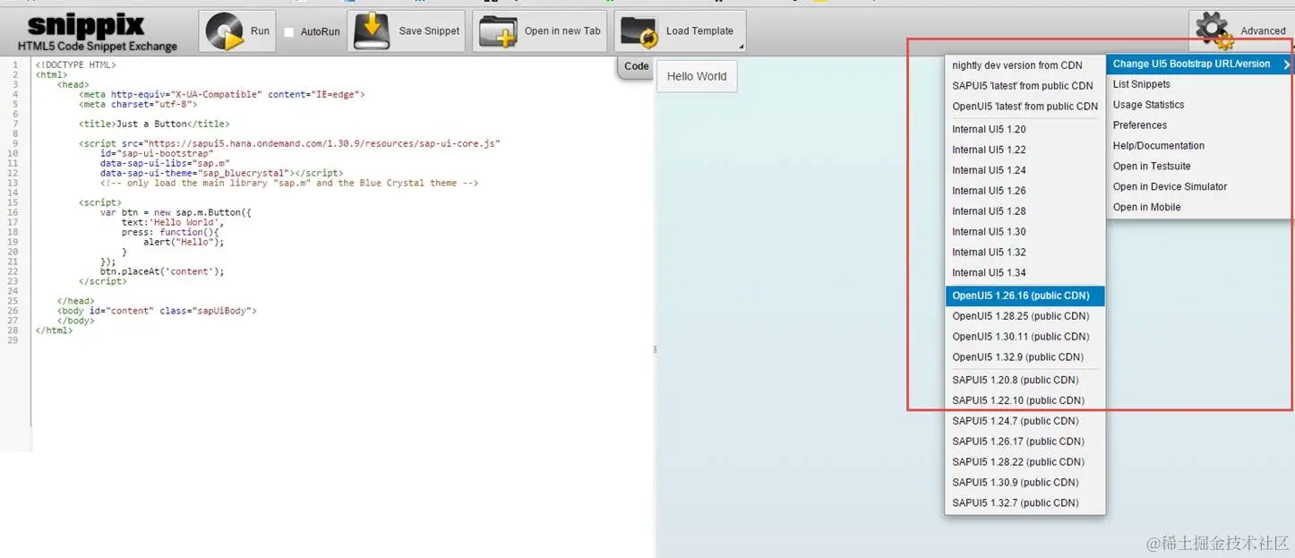 Ben同学也分享了另一种办法:SAP UI5 Snippix,可以切换不同的UI5版本: