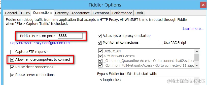 另一种比较通用并且其他公司普遍采取的做法:在自己电脑上装一个Fiddle,扮演reverse proxy的角色。启动Fiddle之后,查看其host name和监听的端口号:
