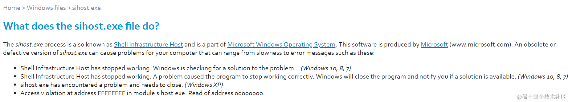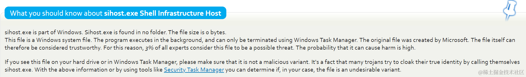 什么是windows10的Shell Infrastructure Host 已注销 2021-04-25 484 阅读1分钟 在windows10操作系统里,shell infrastructure host的可执行镜像为sihost.exe, 是微软操作系统的一部分。 无法在任何文件夹里直接找到这个文件。文件大小为0字节。 要获取更多Jerry的原创文章,请关注公众号"汪子熙":