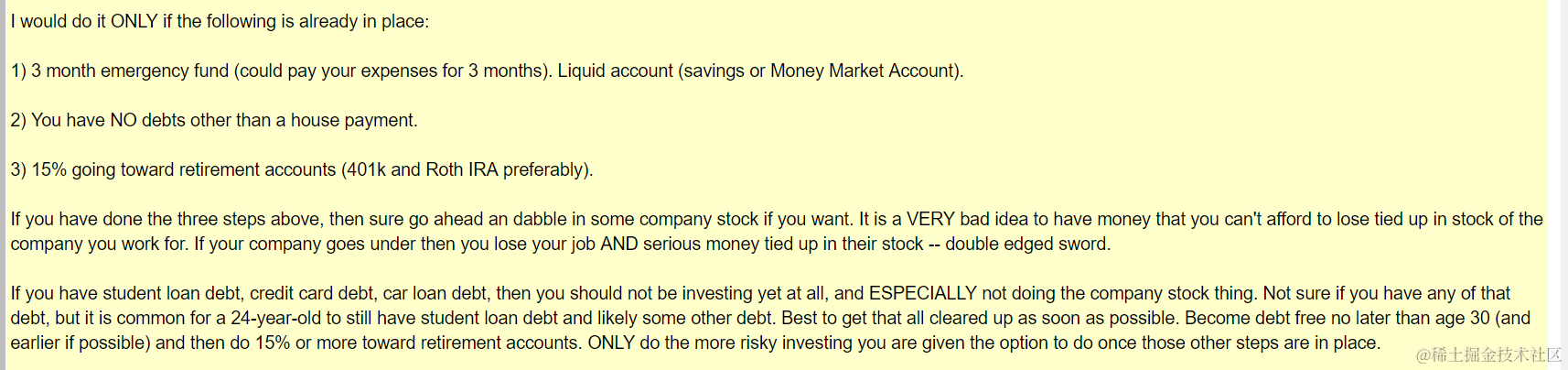 If you have done the three steps above, then sure go ahead an dabble in some company stock if you want. It is a VERY bad idea to have money that you can’t afford to lose tied up in stock of the company you work for. If your company goes under then you lose your job AND serious money tied up in their stock – double edged sword.