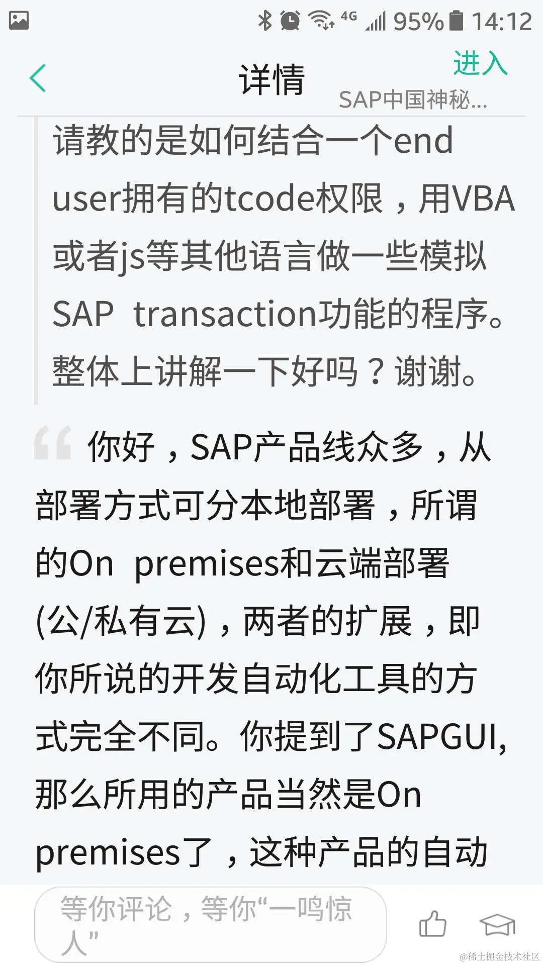 提问: 星主,你好。我们公司使用的是SAP GUI,数据库是hana,服务器都是在国外,我是其中的一个财务人员也就是End User。之前学过MySQL等数据库,也会一点js,php,qt,VBA等。一直在尝试做一些自动化的工具。目前可以用VBA调用BAPI获得SAP中的数据,比如客户的open items。尝试用nodejs,好像要下载rfc sdk,但没权限,也许是我不会下载。我想请教的是如何结合一个end user拥有的tcode权限,用VBA或者js等其他语言做一些模拟SAP transaction功能的程序。整体上讲解一下好吗?谢谢。