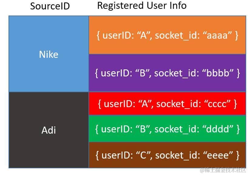 每一个Vue网站启动后,它自己肯定知道自己是Nike,Adi还是Speedo,这些网站连接上后台WebSocket服务器后,首先发一个handshake的请求给WebSocket服务器,payload就只有SourceID = Nike这一条记录。WebSocket服务器接收到之后,在hashmap里分配一条空记录: