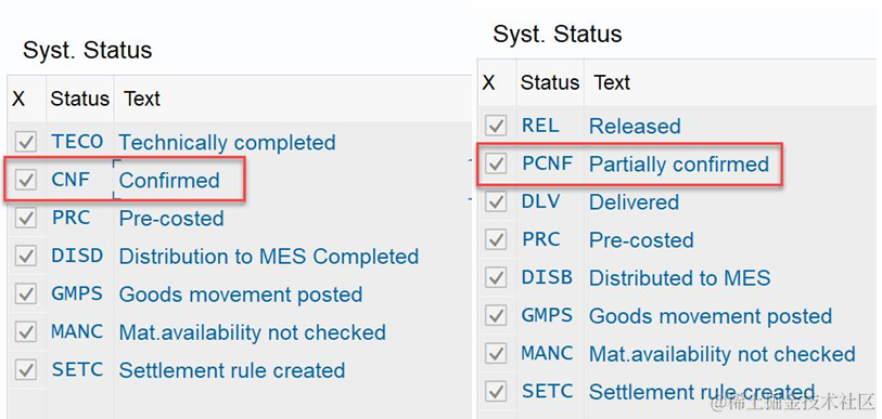 S/4HANA的生产订单,哪个字段可以用来做生产完成的标志位 已注销 2021-04-25 110 阅读1分钟 看状态里面一个confirmed(CNF)的状态,出现这个状态就说明是完全的数量都报工了。 如果是部分报工的话就是PCNF,不过如果生产订单行项目生产的成品数量为1的话,就不会出现这个状态。CNF上面那个TECO状态的意思是订单结束了,一般全部报工就会自动结束,但是也有的情况是订单被非正常关闭,所以不建议看上面那个状态。就看CNF就行。 要获取更多Jerry的原创文章,请关注公众号"汪子熙":