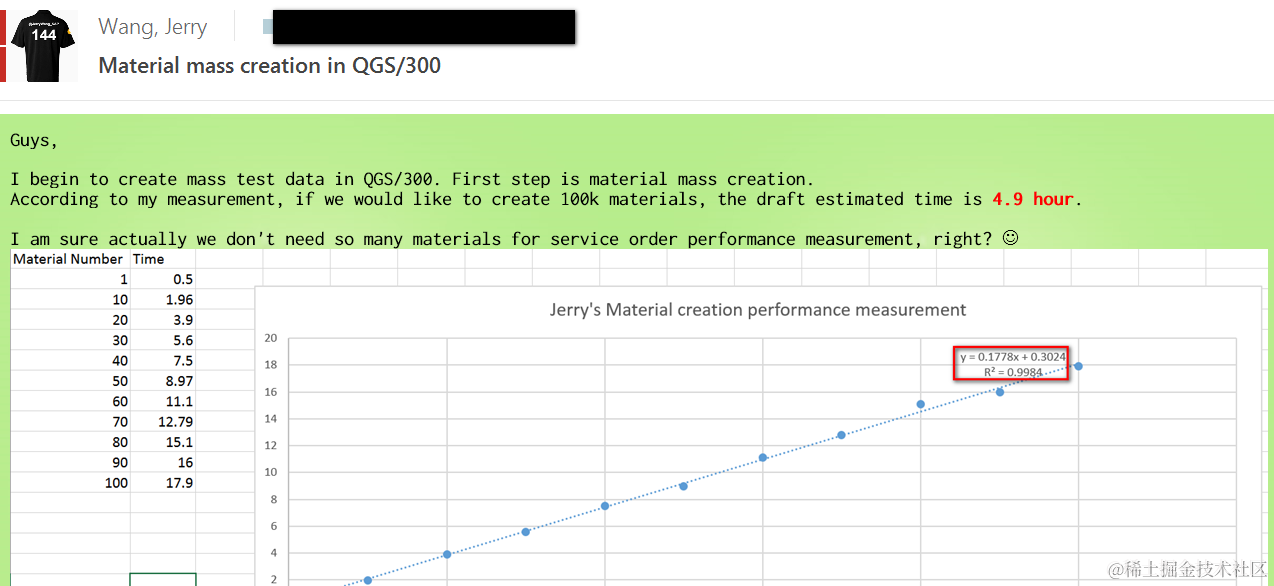 Excel里做一个line regression analysis, 得出R2 = 0.9984 > 0.99, 得出时间和material数量在这有限的10组测试数据表现为线性相关,
