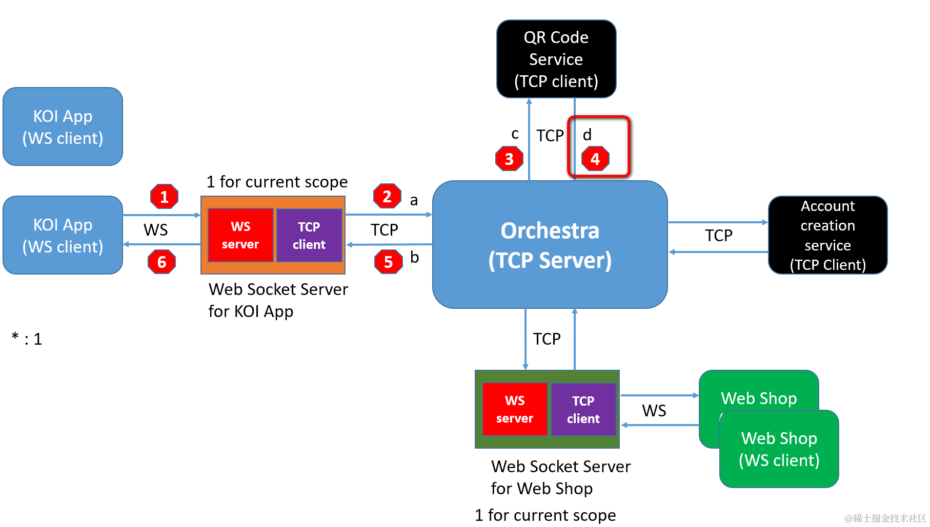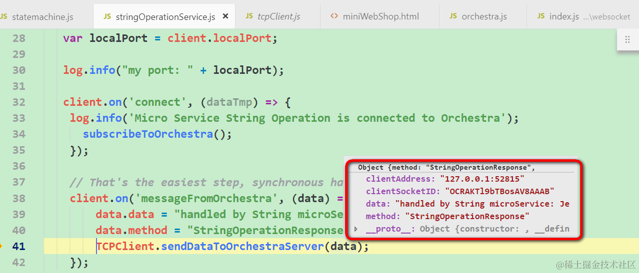 步骤4 - 微服务提供者接收请求,提供服务并传回给Orchestra 已注销 2021-04-25 81 阅读1分钟 微服务通过TCP client接收请求: 在technical stack的tcpClient.js里接受Orchestra发送过来的请求,然后通过事件messageFromOrchestra投递给具体的微服务实现: 微服务完成业务逻辑后,把响应发回给Orchestra: 注意上图的clientAddress是web socket服务器对应的IP地址和端口: 要获取更多Jerry的原创文章,请关注公众号"汪子熙":