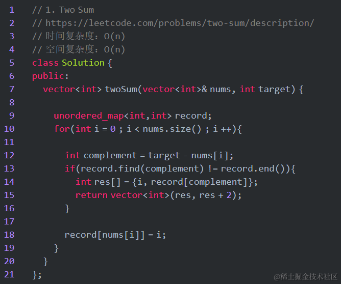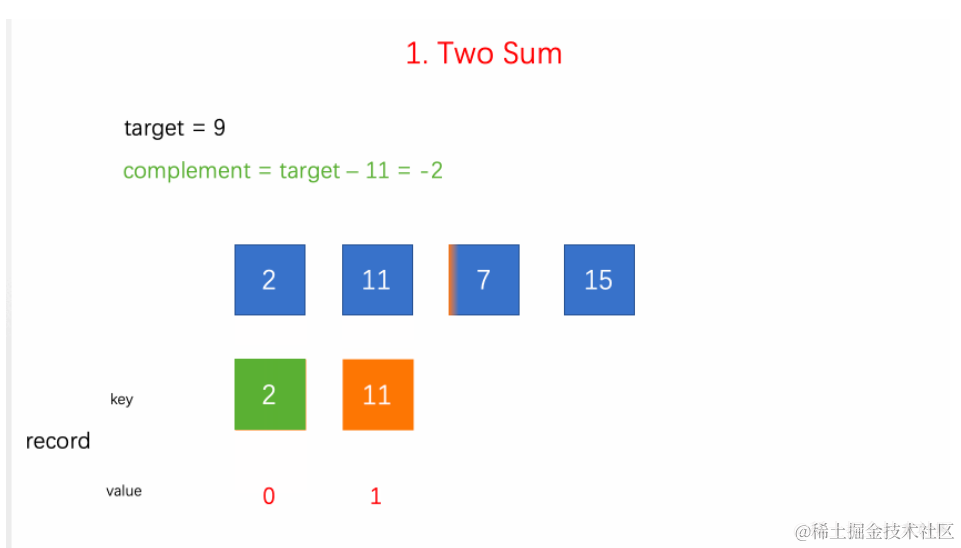 比如已知数组[2, 7, 11, 15], 目标值为9,数组前两个元素的和 2 + 7 = 9,所以2和7就是需要找的两个数。