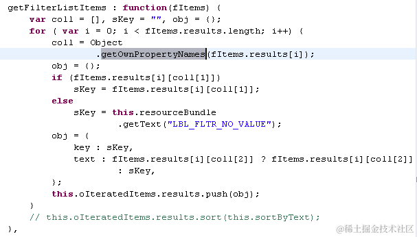 getFilterListItems assumes for the order returned from Object.getOwnPropertyNames is always in the same order. Hence coll[1] is always the key, and coll[2] is always the text.