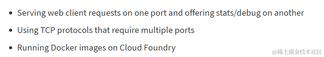 Configuring custom app ports allows developers to bring workloads onto Cloud Foundry that listen on ports other than 8080. Here are some example use cases:
