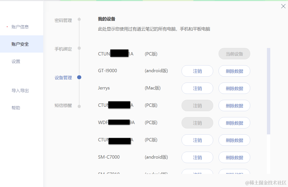 网易云笔记的登录设备管理,非常安全 已注销 2021-04-25 149 阅读1分钟 作为一款云笔记解决方案,网易云笔记允许我们在PC端的网页和客户端登录,以及移动设备比如手机,平板电脑等。 在账户安全-设备管理的菜单里,我们能够方便地对曾经登录过网易云笔记的终端进行管理。 曾经登录过的设备列表一览无余: 可以很方便的远程注销和远程删除云端数据: 要获取更多Jerry的原创文章,请关注公众号"汪子熙":