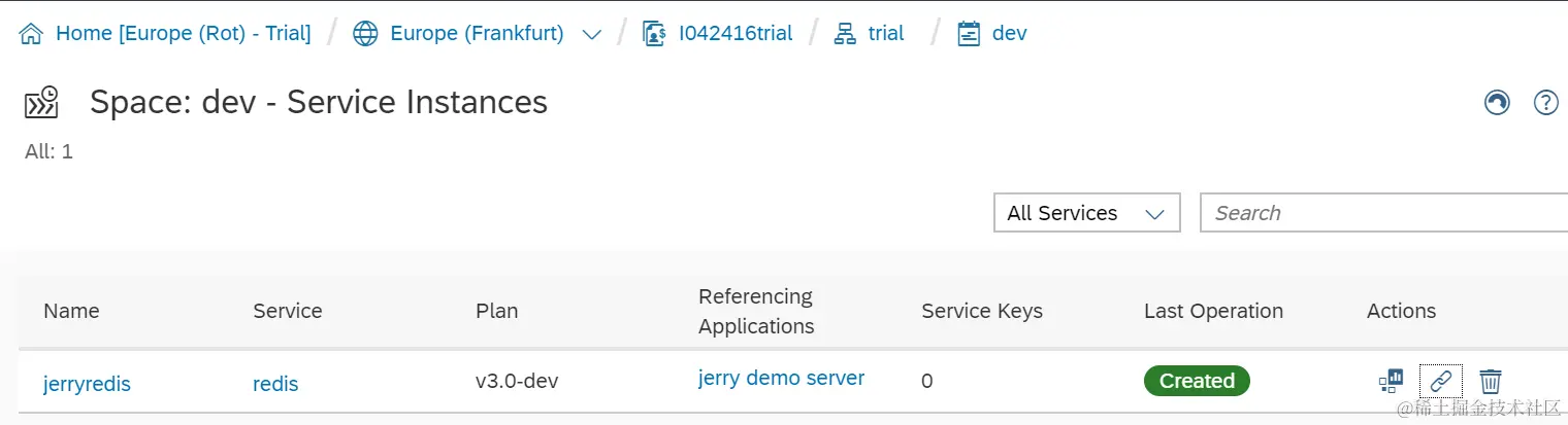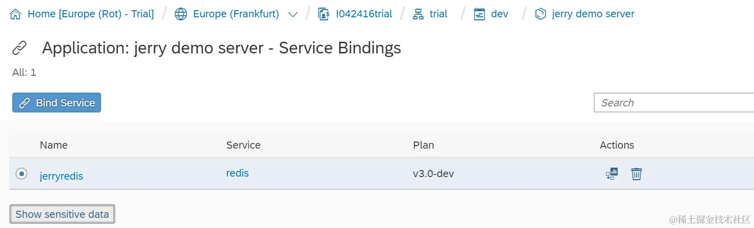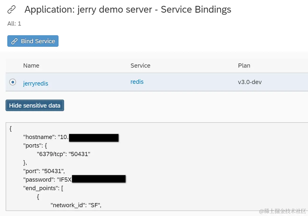 如何把nodejs应用和SAP云平台上的Redis实例做绑定 已注销 2021-04-25 82 阅读1分钟 选择CloudFoundry上服务实例列表里的Redis实例,点击Actions标签栏下面的Bind图标: 从application列表里选择要绑定的应用实例: 选择好之后,点Save即可绑定。 绑定之后的效果: 点Show Sensitive data可以查看Redis服务暴露的host,端口等敏感数据。 要获取更多Jerry的原创文章,请关注公众号"汪子熙":