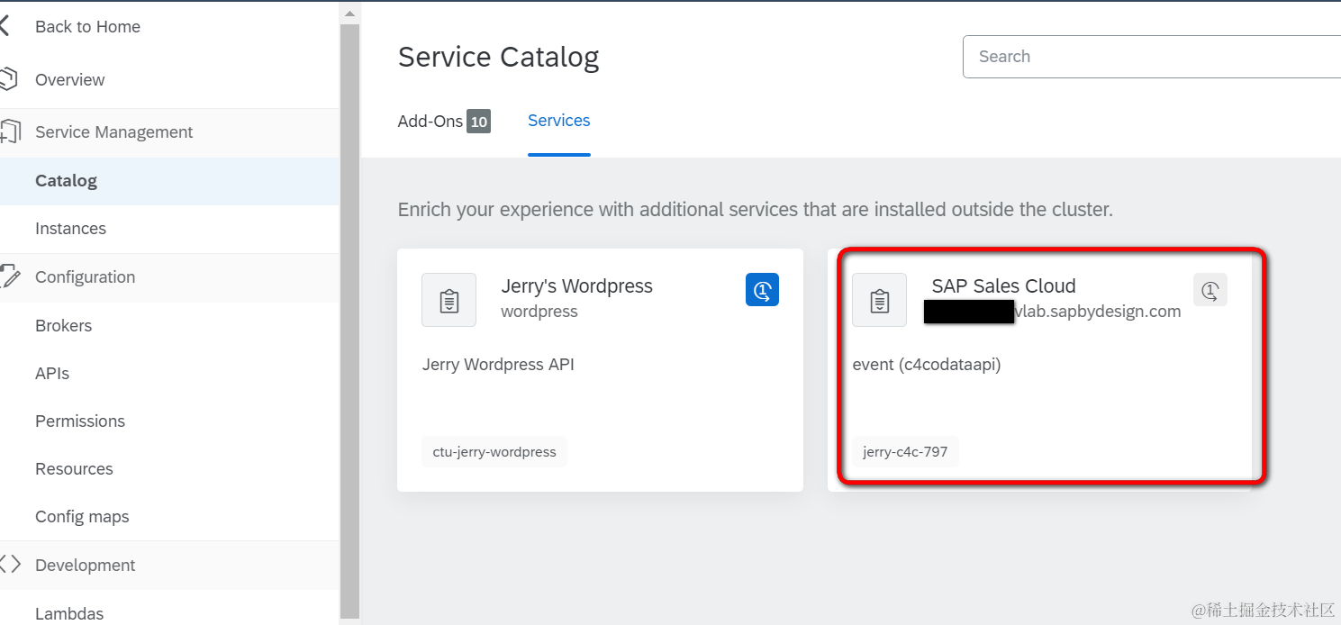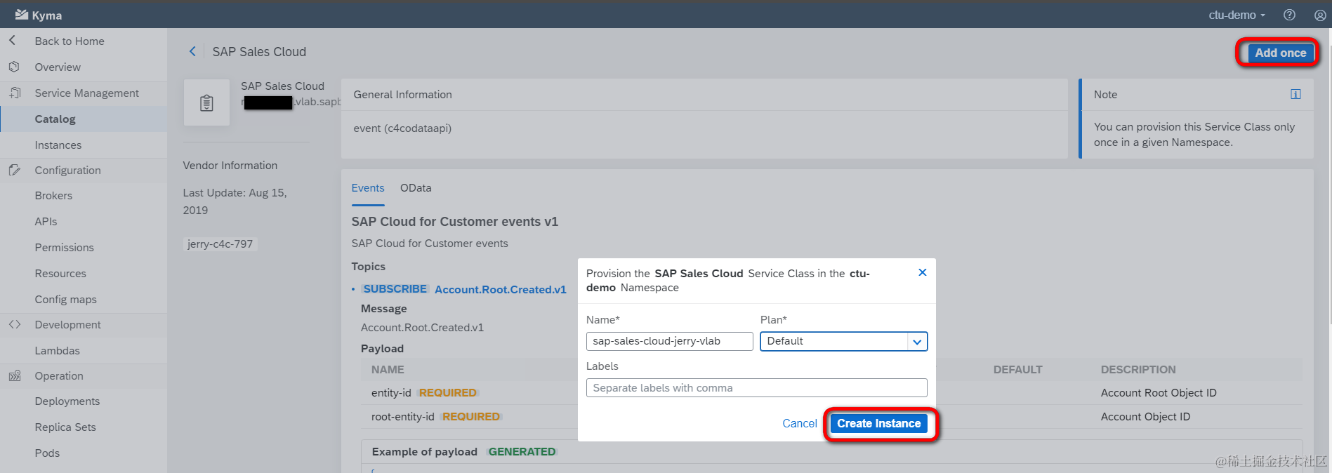 进入Kyma Service Management的Catalog界面下,找到从Cloud for Customer系统导入进来的服务,