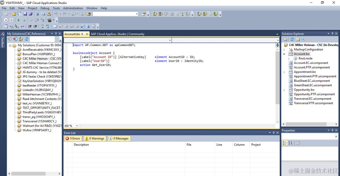 大家可以试着比较一下,如何使用C4C传统的二次开发方式,该如何监听BO的创建和更新事件呢?那就是使用SAP Cloud Application Studio,在Solution里创建BO增强,然后在BO节点上创建AfterModify并通过ABSL编程实现。