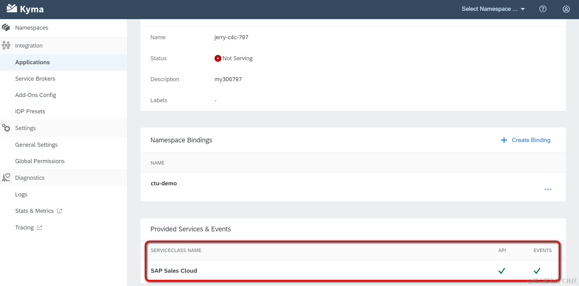 回到Kyma的应用界面,在Provided Services & Events界面下,此时能看到Cloud for Customer发布过来的API和事件了: