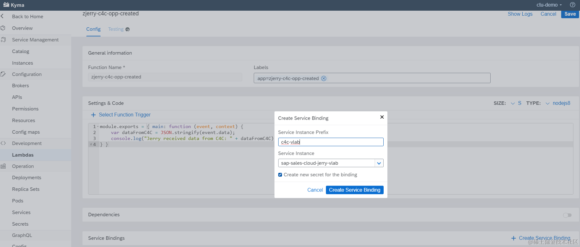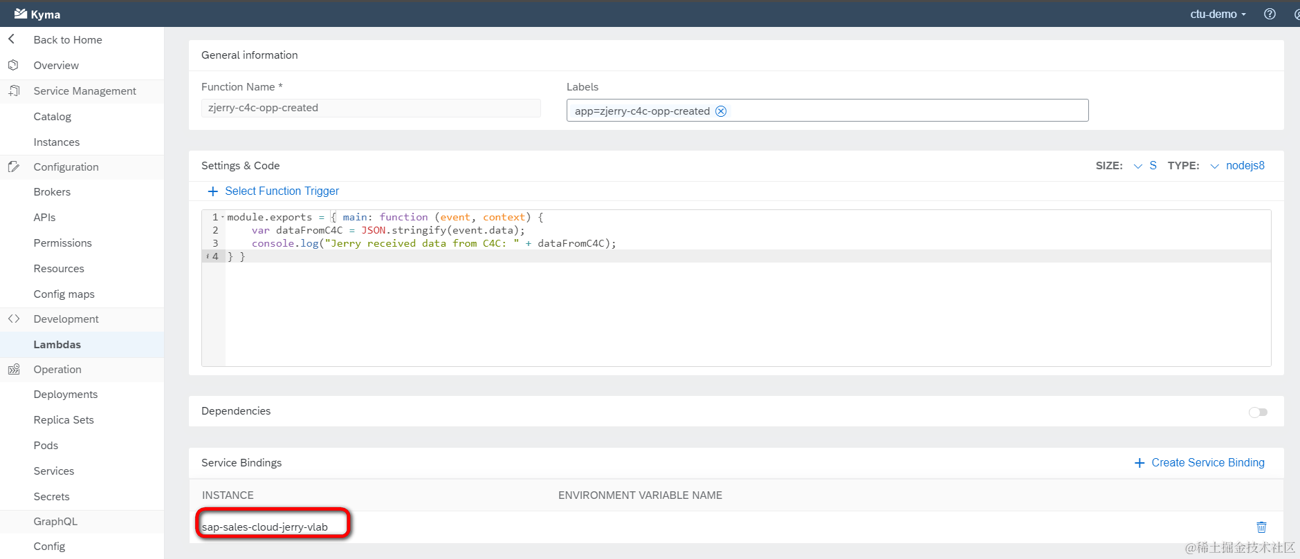由于文章篇幅原因,这里暂时不介绍在Kyma Lambda Function里如何调用C4C的OData API,而只是简单的打印出C4C传递过来的事件参数: