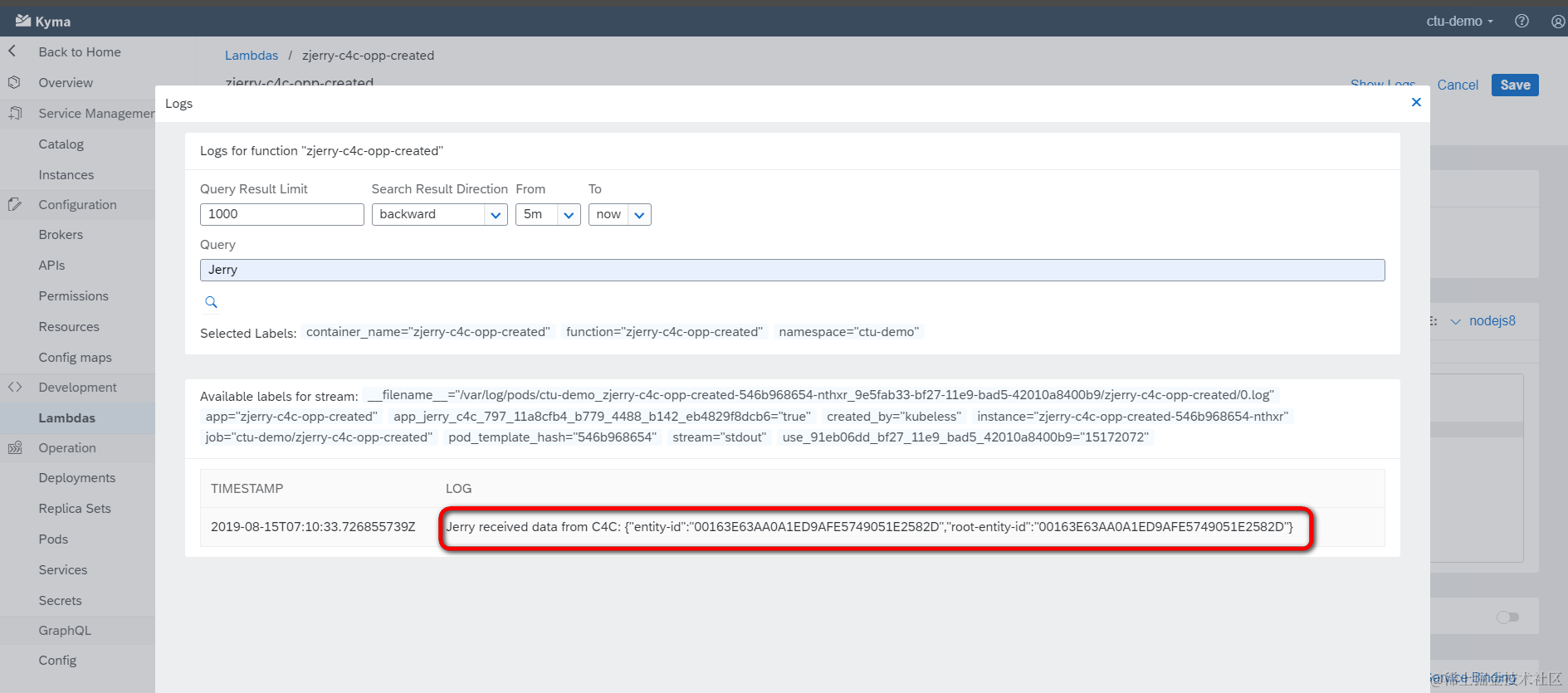 再回到Kyma Lambda Function的日志界面,这里也看到了Lambda Function实现体里打印出的来自C4C的事件明细: