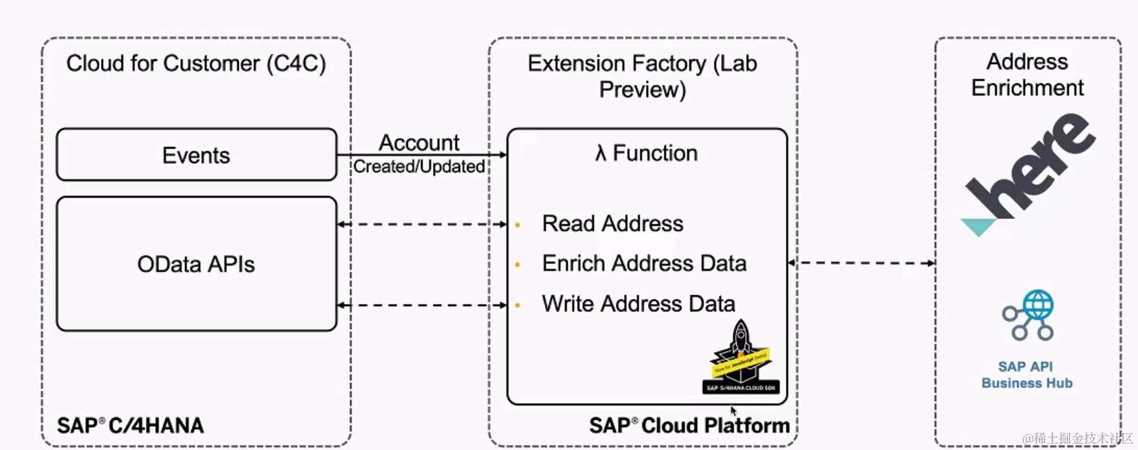 比如实现一个Account Address Enrichment的功能,就是用户在C4C里创建Account时,只需要维护基本的地址信息,然后点击保存,C4C发送事件给Kyma,后者接到这个事件后,调用SAP API Hub上的Address微服务,把丰富过后的地址详情通过C4C Account OData API调用的方式,写回C4C。通过这个增强,减少了C4C用户录入数据的工作量,同时也展示了Kyma与被其扩展的C/4HANA产品的数据双向读写功能。