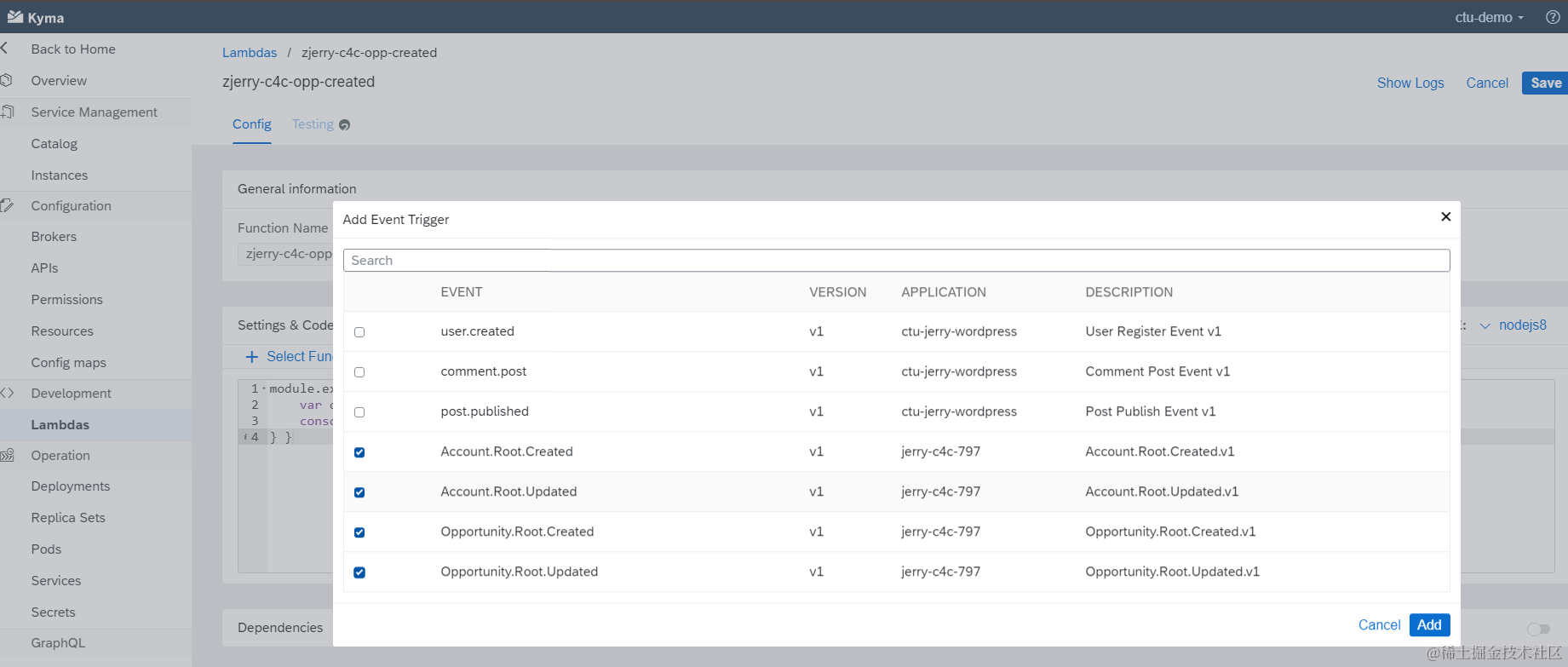 Lambda Function的触发方式,选择之前C4C暴露的BO创建和修改事件: