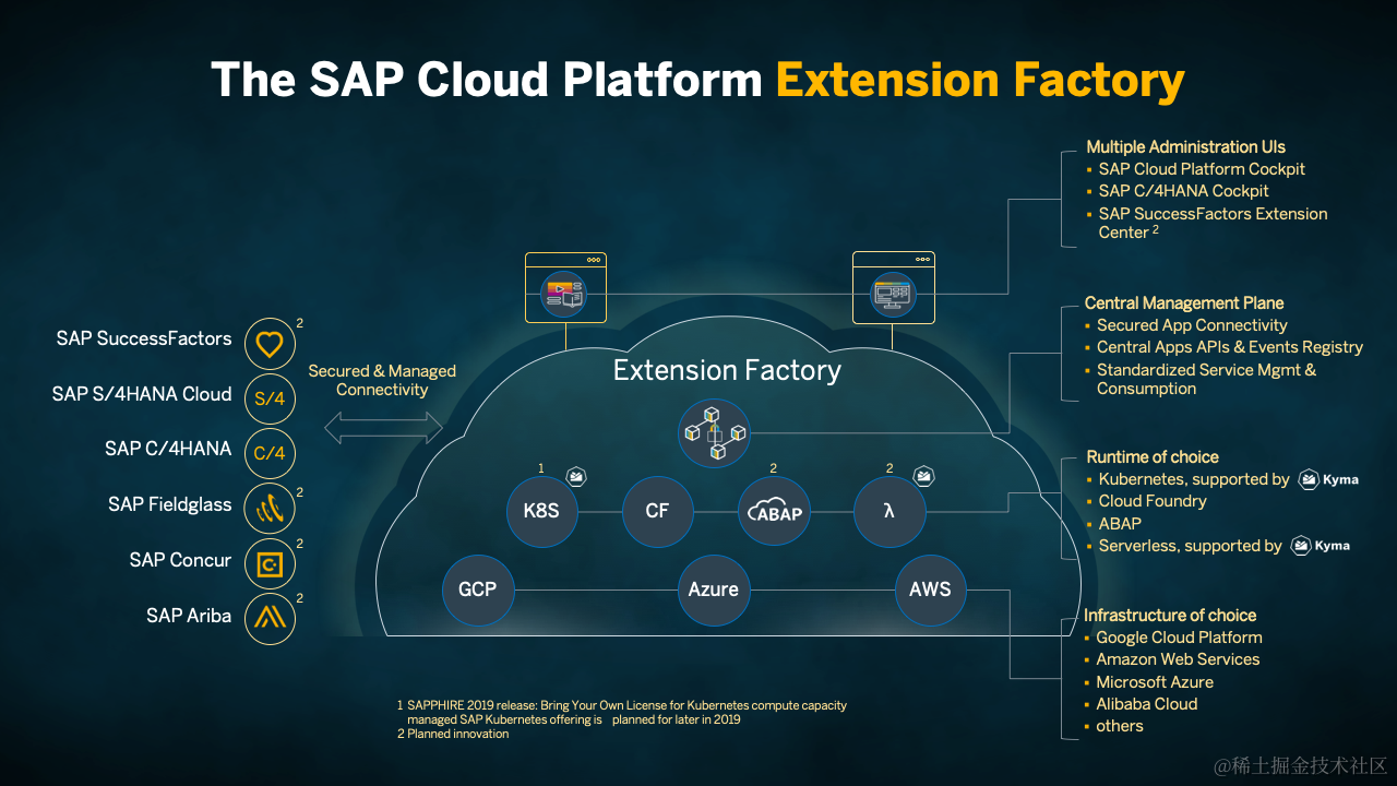 而SAP Cloud Platform Extension Factory,是SAP在开源项目Kyma上进一步完善而推出的一个商业化解决方案,本身并不单独卖,而是作为SAP云平台的一个组成部分。