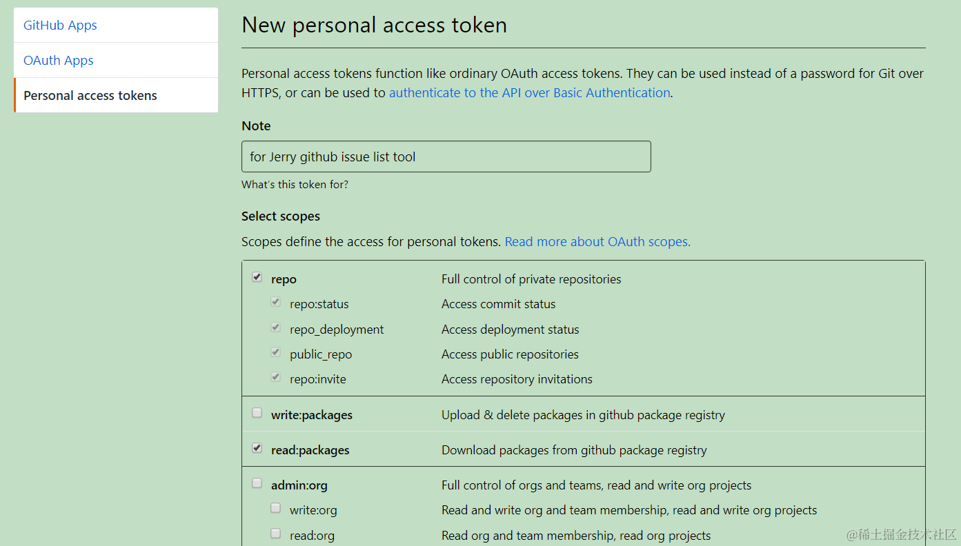 如何获得github的oauth access token 已注销 2021-04-25 471 阅读1分钟 点击Github用户图标下的settings: 点developer settings: Personal Access Tokens,点Generate new token生成一个新的token: 生成token时,可以选择拿到这个token后,能够拥有哪些权限: 把生成的token保存到某地,下图是在Postman里消费github某个API时,传入token的一个例子: 要获取更多Jerry的原创文章,请关注公众号"汪子熙":