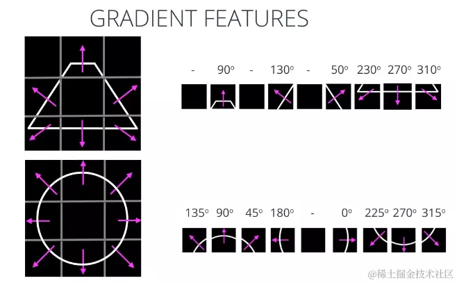 以下面这张图里的梯形和圆形为例,我们把图形均匀地分成9个区域,在图形中心观察每个区域内图形单元的梯度方向,就可以实现降维,把二维图像以一个一维矩阵来表示。