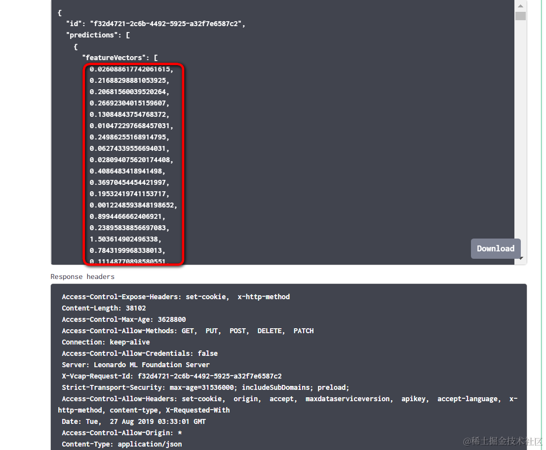 当然,除了直接上传包含了图片特征向量的压缩文件之外,将这些文件包含的特征向量内容以JSON字符串的方式作为输入调用API也是可行的,JSON字符串的格式在SAP官网里有详细说明,这里不再赘述。