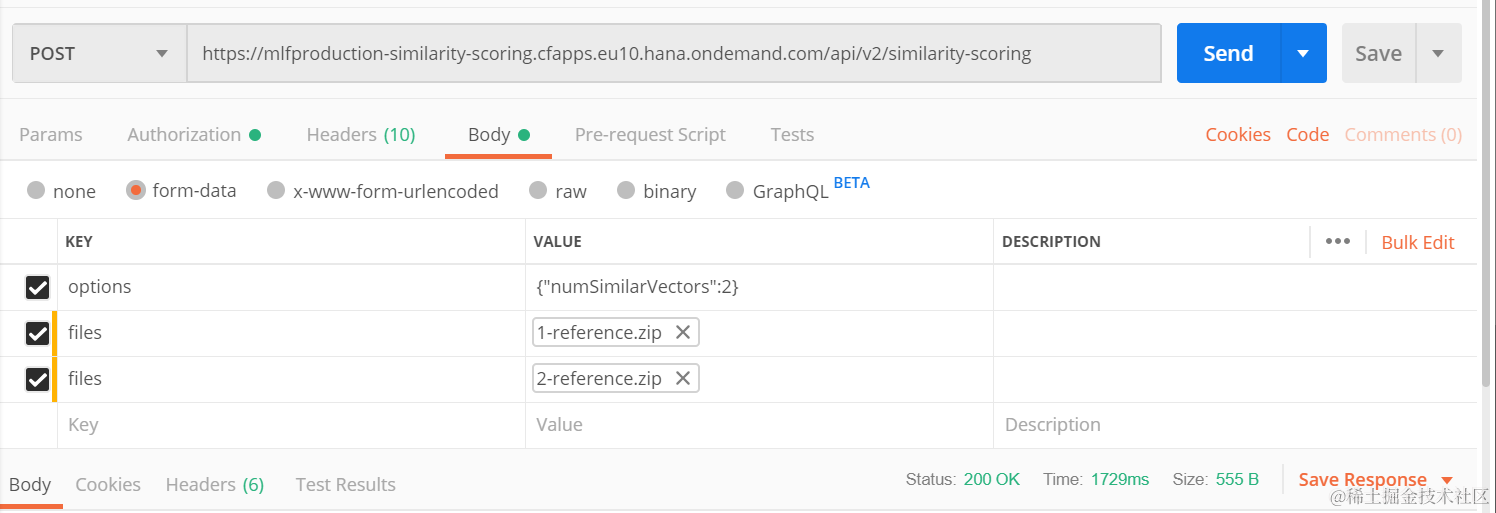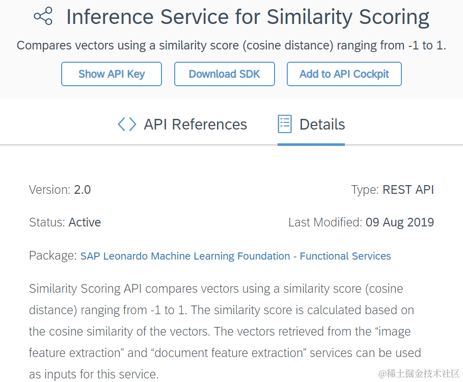 既然我们如今已经拿到了待识别图片的特征向量,那么可以尝试第二种思路,即利用Leonardo上的另一个和图片处理相关的人工智能服务:图片相似度评分https://api.sap.com/api/similarity_scoring_api/overview