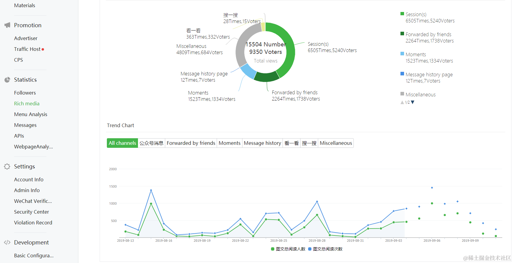It provides powerful analytis dashboard which can easily give you rich statistics data in every dimension, such as for each article, how many followers have read it, forward it, click “like” button etc.