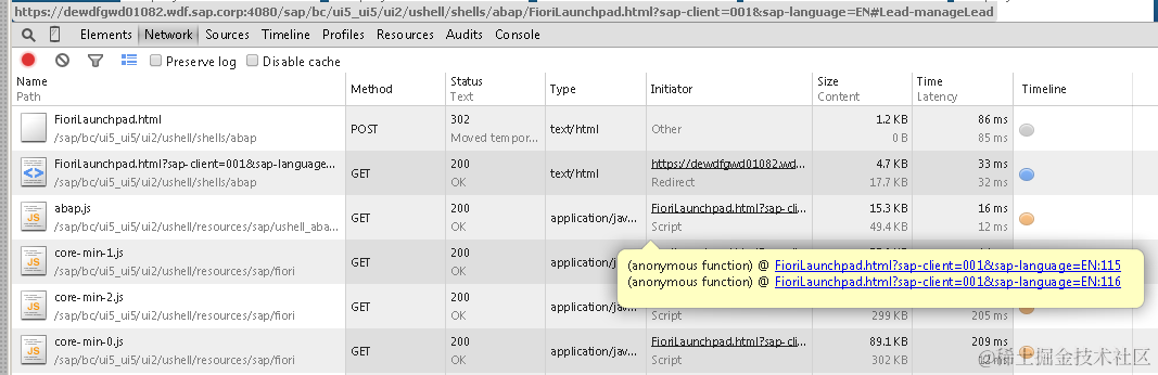 Network里能看到abap.js是在 FioriLaunchpad.html的115行加载的: