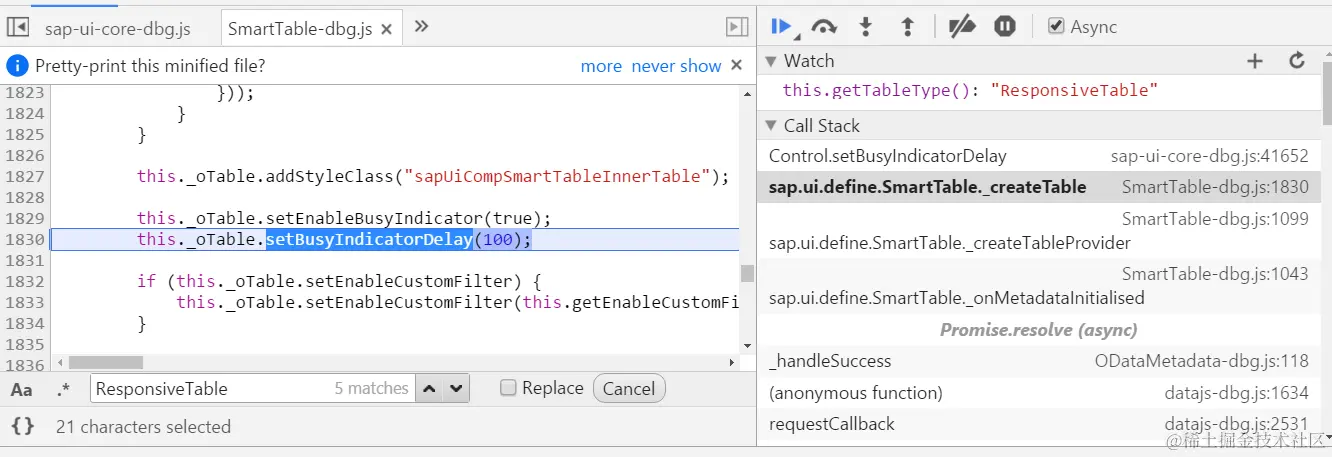 UI5 setBusyIndicatorDelay 已注销 2021-04-25 61 阅读1分钟 getTableType(): ResponsiveTable sap.ui.define.SmartTable._createTable sap.ui.define.SmartTable._onMetadataInitialised Promise.resolve(async) setBusyIndicatorDelay(100) this._oTable.setEnableCustomFilter 要获取更多Jerry的原创文章,请关注公众号"汪子熙":
