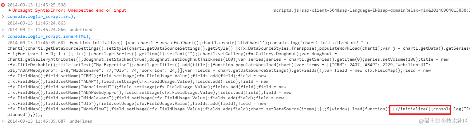 但是framework 将application 里的Javascript 重新处理后,会将application中的换行符全部删除,这样// 后面的所有code也会被merge成同一行,被// 所注释。将// 使用/* */ 替换即可。